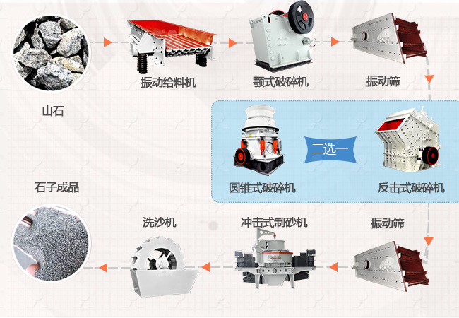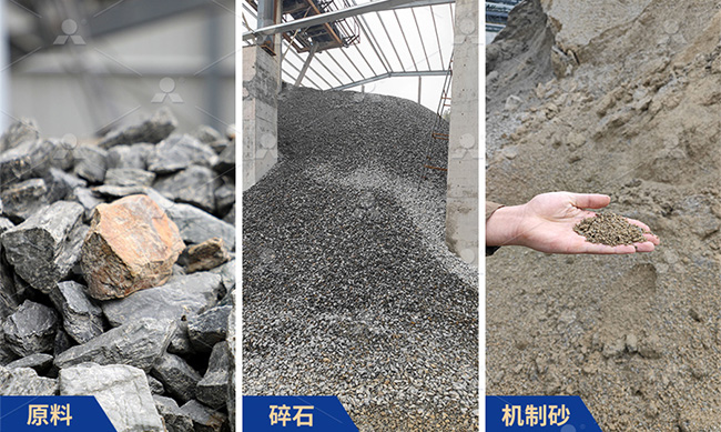 首先,山石經(jīng)過給料機進入破碎機進行破碎,破碎后的碎石再進入制砂機進行制砂處理。制出的機制砂經(jīng)過篩分設(shè)備進行篩選,以滿足不同的粒度要求。最后,經(jīng)過輸送設(shè)備將機制砂輸送到指定的地點。